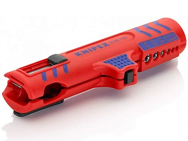 Универсальный стриппер, оснащенный выдвижным ножом, предназначен для снятия внешней защитной оболочки с круглых водостойких кабелей в диапазоне Ø 8-13 мм, в частности, кабелей NYM от 3х1,5 до 5х2,5.