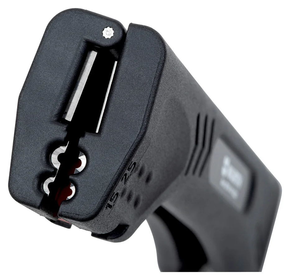 Универсальный стриппер, оснащенный выдвижным ножом, предназначенный для снятия защитной оболочки с круглых и плоских кабелей шириной до 15 мм, зачистки проводов 1,5 / 2,5 мм².
