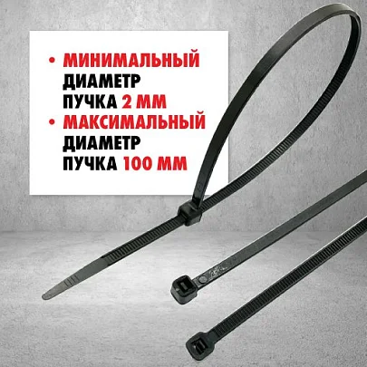 Нейлоновый хомут черного цвета, изготовленный из первичного полиамида 66, предназначен для крепления кабеля и проведения других монтажных работ как в помещении, так и на открытом воздухе