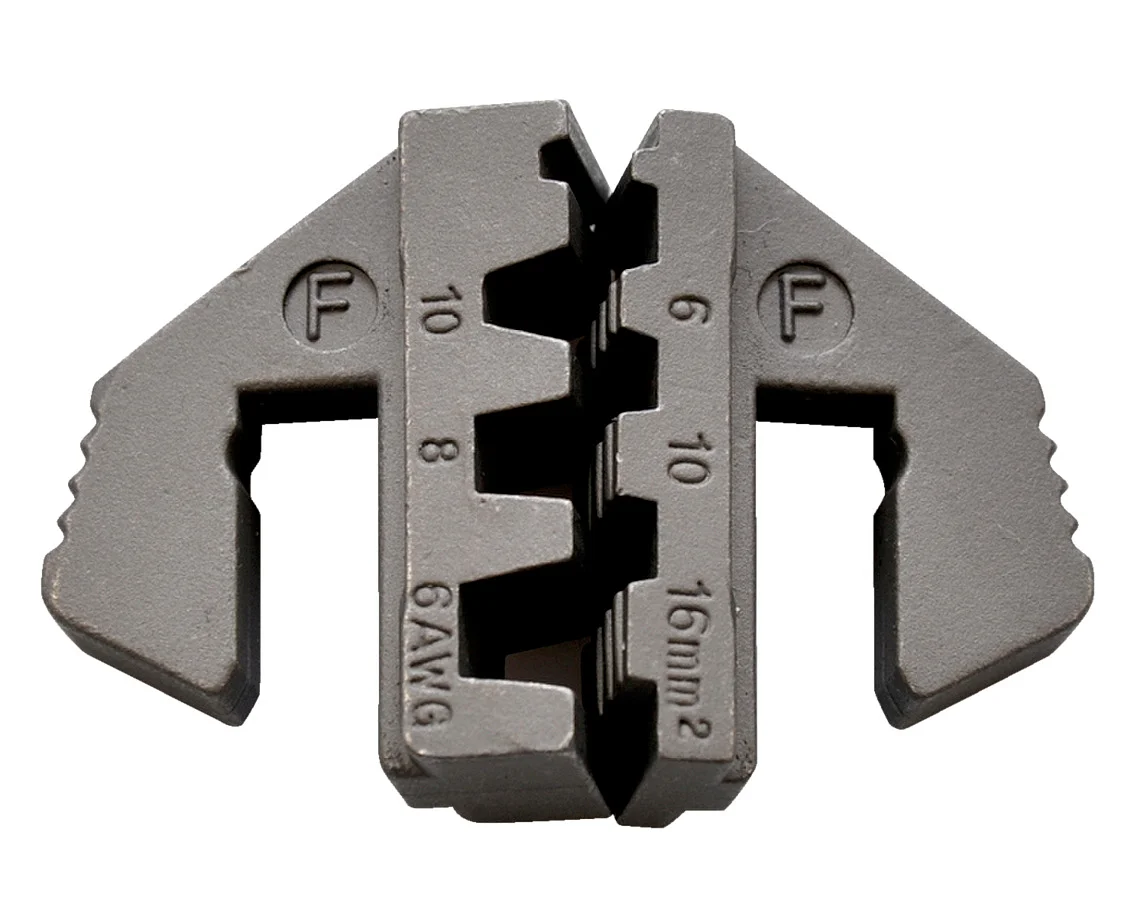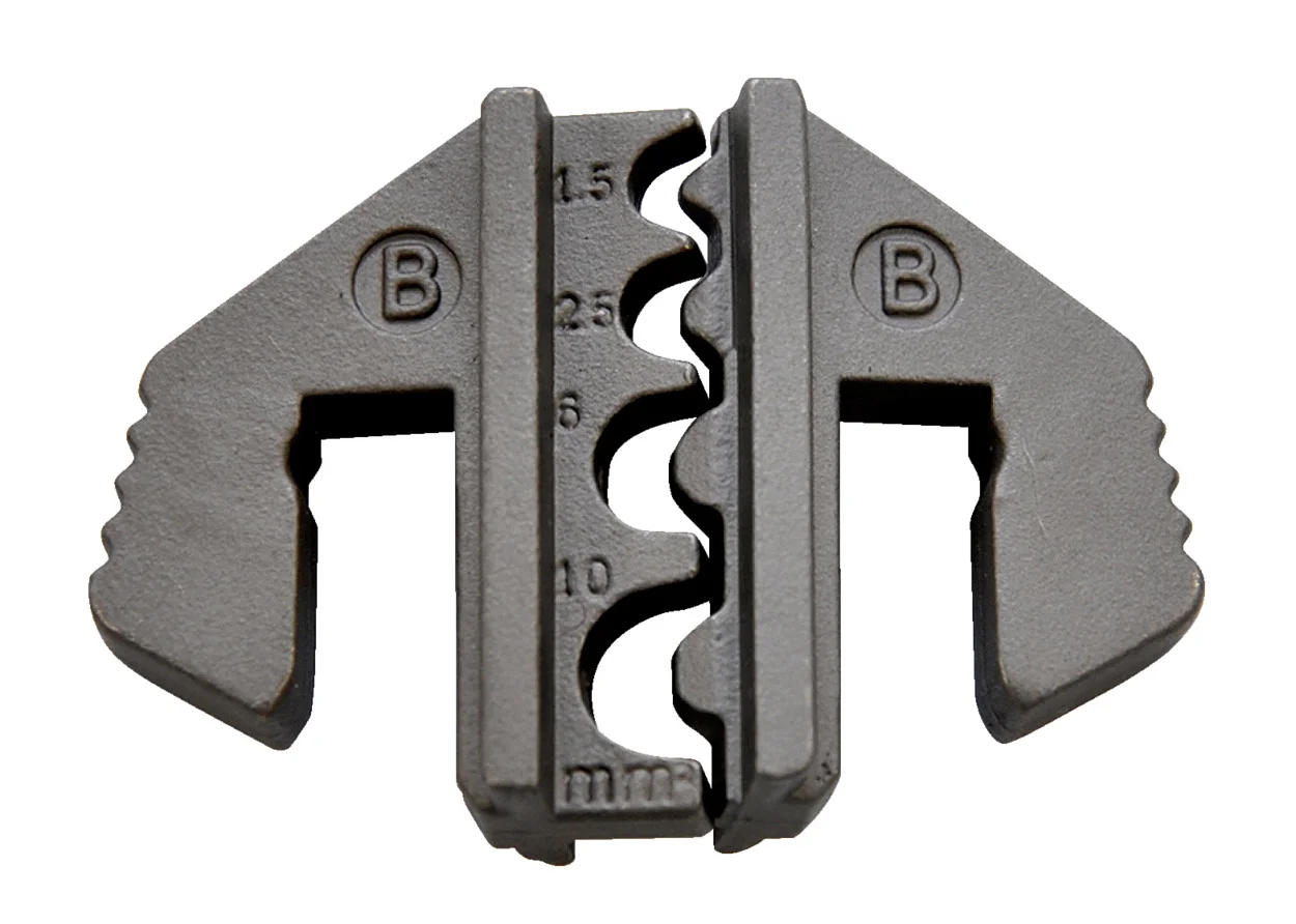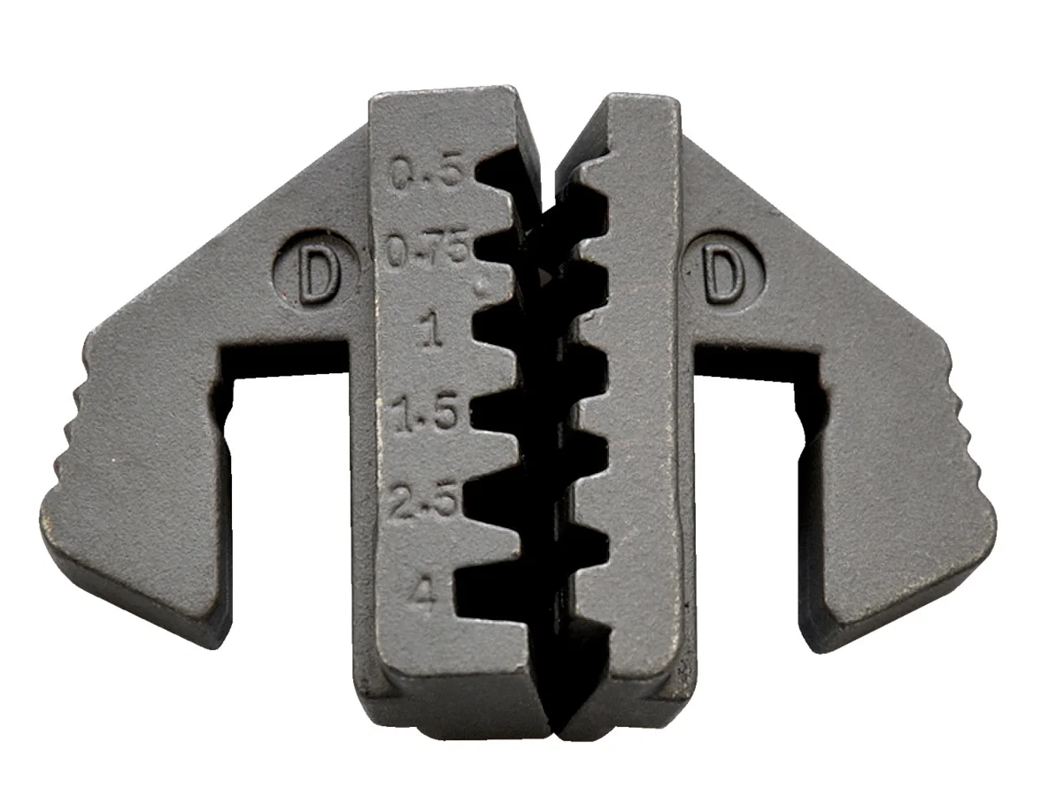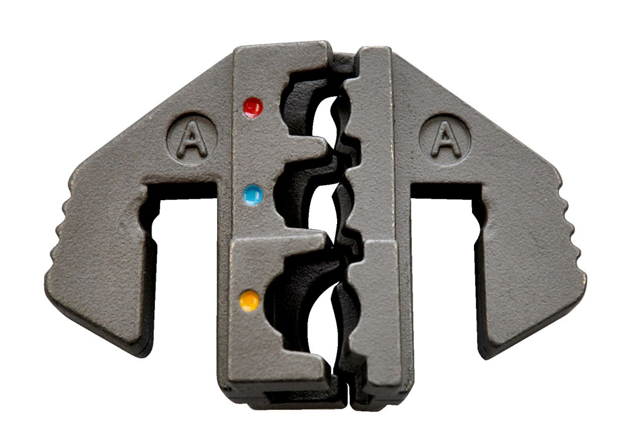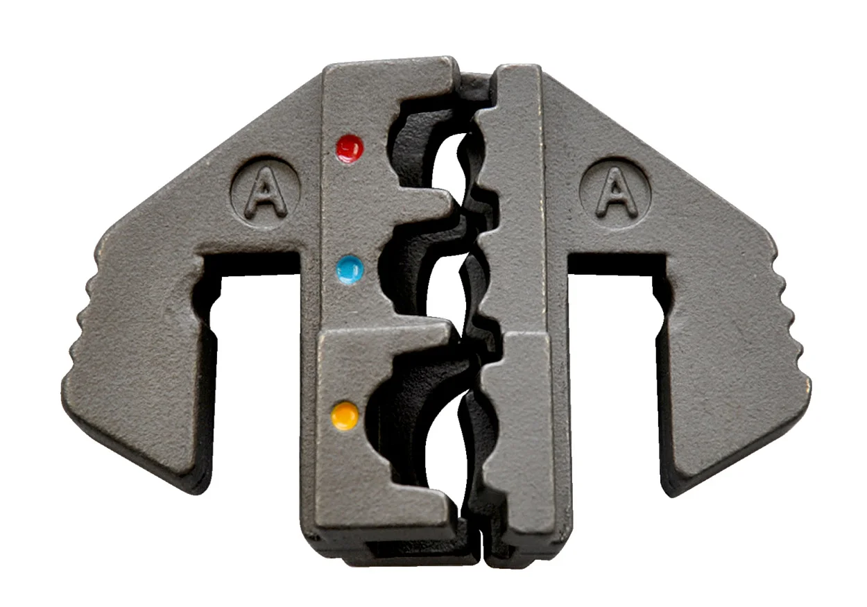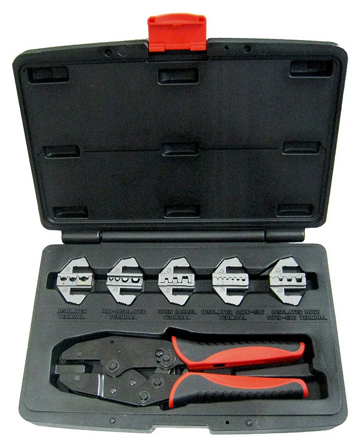 Обжимные клещи (кримпер) с пятью сменными матрицами для обжима изолированных, неизолированных, силовых и трубчатых наконечников в широком диапазоне сечений проводника; поставляется в пластиковом кейсе.