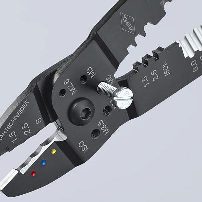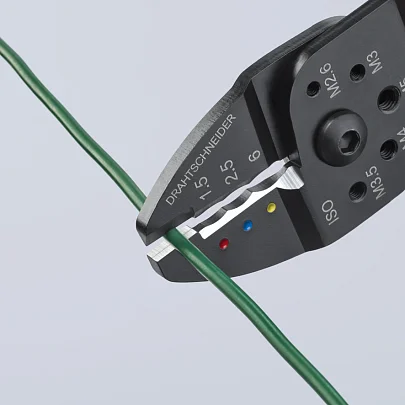 - В средней части инструмента расположены ответные режущие кромки для снятия изоляции для сечений проводника: 0,75 / 1,0 / 1,5 / 2,5 / 4,0 / 6,0 мм²