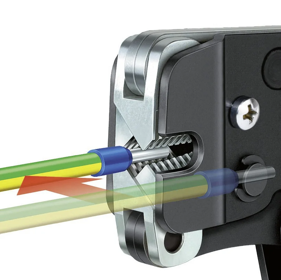 Автоматическая настройка на диаметр контактной гильзы и работа храповика исключают ошибки опрессовки; фронтальная установка заготовки под обжим повышает скорость и обеспечивает удобство работы.
