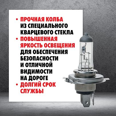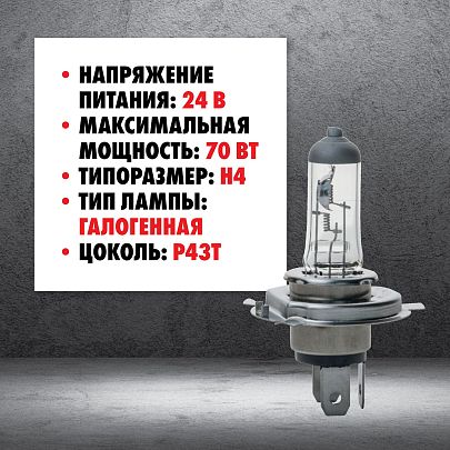 Автомобильная лампа галогенная с двумя нитями накала с посадочным гнездом фланцевого типа для рефлекторных передних фар грузовых автомобилей и внедорожников. Вторая нить накала оснащена рефлектором для устранения паразитной засветки.