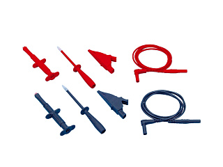 - 4-миллиметровые измерительные провода, силиконовая изоляция, длина = 1 м; поперечное сечение 1,0 мм²; номинальный ток 19 А; термостойкость от -80 до +150 °C. Одна сторона с прямой защитной заглушкой, противоположная сторона с угловой защитной заглушкой 4 мм.