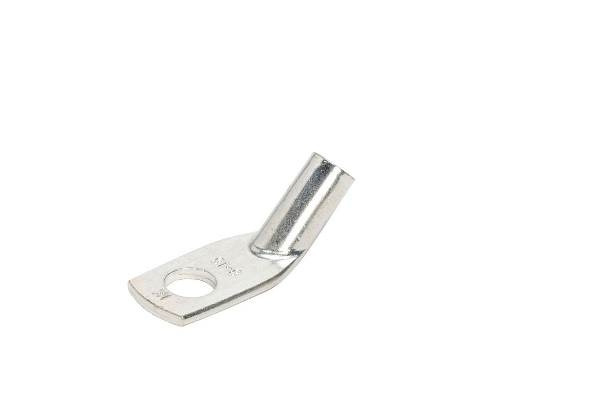 Силовой неизолированный угловой наконечник с углом 45° между осью гильзы и плоскостью контактной части предназначен для оконцевания опрессовкой (шестигранный обжим) жил медных кабелей и проводов, особенно в условиях весьма ограниченного пространства для электромонтажа.
