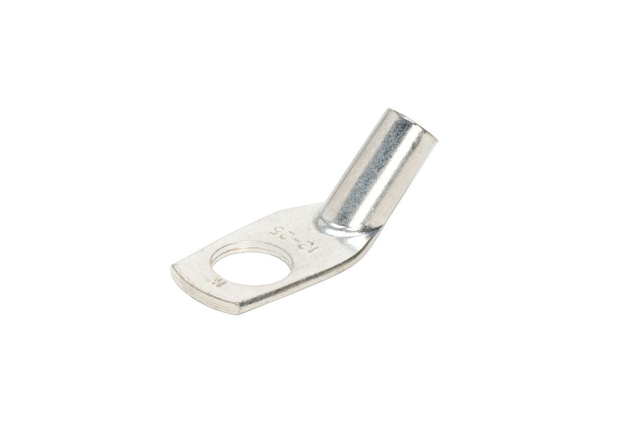 Силовой неизолированный угловой наконечник с углом 45° между осью гильзы и плоскостью контактной части предназначен для оконцевания опрессовкой (шестигранный обжим) жил медных кабелей и проводов, особенно в условиях весьма ограниченного пространства для электромонтажа.