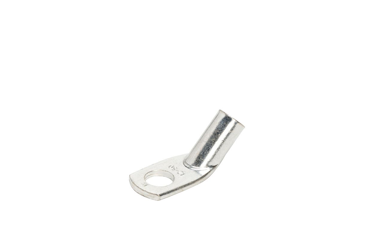 Силовой неизолированный угловой наконечник с углом 45° между осью гильзы и плоскостью контактной части предназначен для оконцевания опрессовкой (шестигранный обжим) жил медных кабелей и проводов, особенно в условиях весьма ограниченного пространства для электромонтажа.