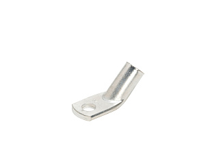 Силовой неизолированный угловой наконечник с углом 45° между осью гильзы и плоскостью контактной части предназначен для оконцевания опрессовкой (шестигранный обжим) жил медных кабелей и проводов, особенно в условиях весьма ограниченного пространства для электромонтажа.