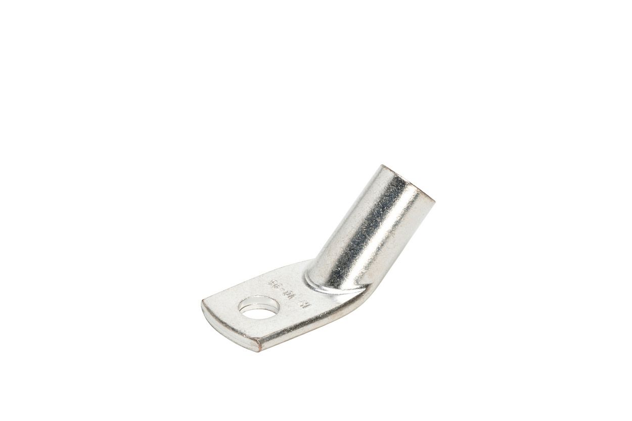 Силовой неизолированный угловой наконечник с углом 45° между осью гильзы и плоскостью контактной части предназначен для оконцевания опрессовкой (шестигранный обжим) жил медных кабелей и проводов, особенно в условиях весьма ограниченного пространства для электромонтажа.