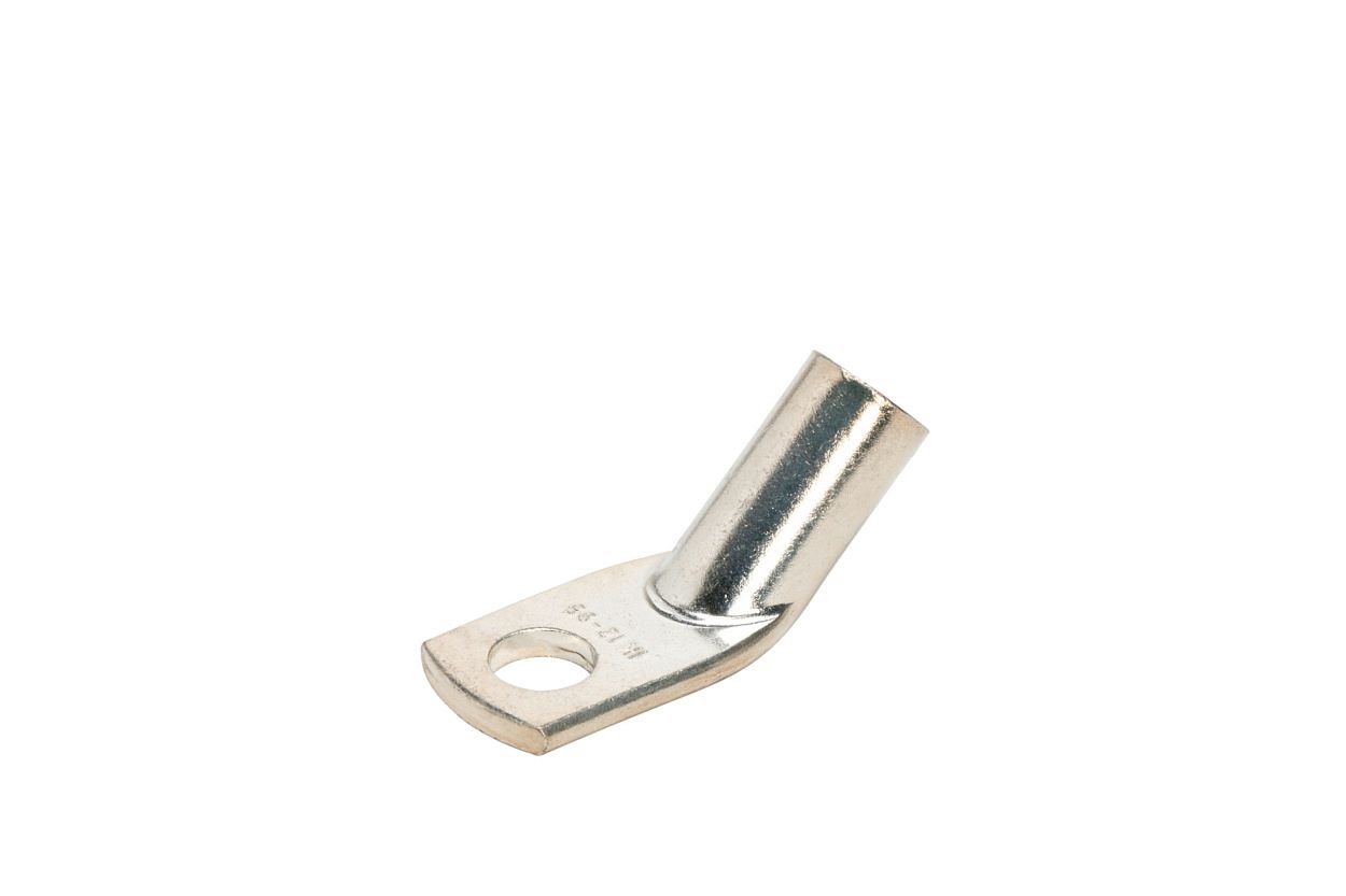 Силовой неизолированный угловой наконечник с углом 45° между осью гильзы и плоскостью контактной части предназначен для оконцевания опрессовкой (шестигранный обжим) жил медных кабелей и проводов, особенно в условиях весьма ограниченного пространства для электромонтажа.