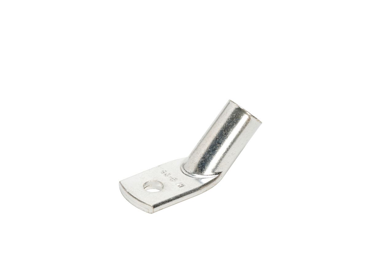 Силовой неизолированный угловой наконечник с углом 45° между осью гильзы и плоскостью контактной части предназначен для оконцевания опрессовкой (шестигранный обжим) жил медных кабелей и проводов, особенно в условиях весьма ограниченного пространства для электромонтажа.