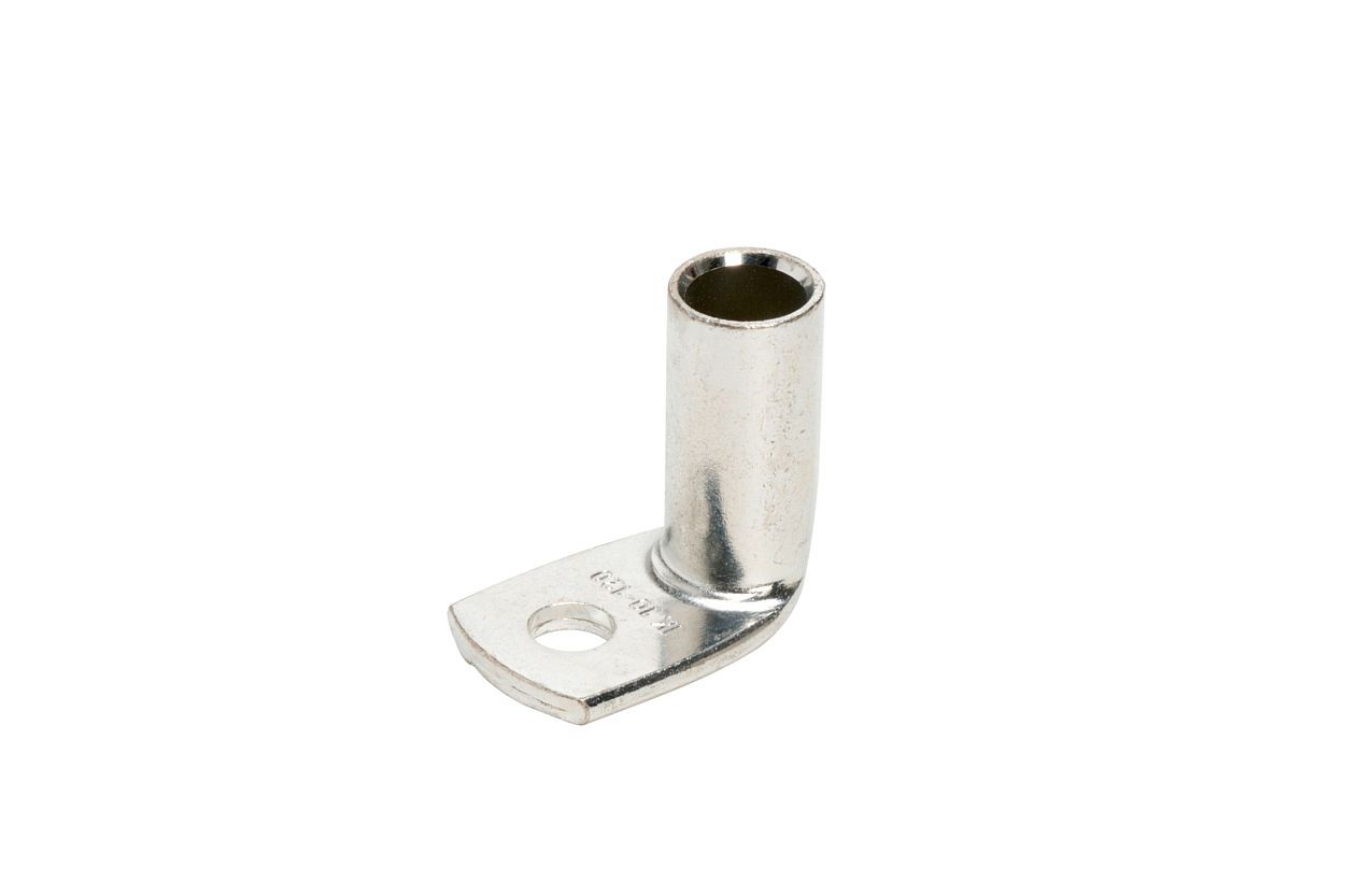 Силовой неизолированный угловой наконечник с углом 90° между осью гильзы и плоскостью контактной части предназначен для оконцевания опрессовкой (шестигранный обжим) жил медных кабелей и проводов, особенно в условиях весьма ограниченного пространства для электромонтажа.