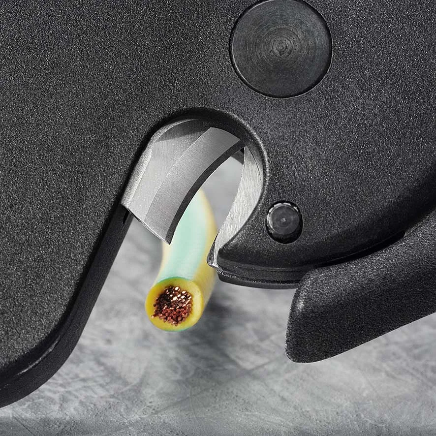 Многофункциональный стриппер-кримпер с тремя функциями: зачистка провода до 10 мм², обжим до 4 мм², 2 x 2,5 мм² и резка мягкой проволоки сечением до 10 мм²