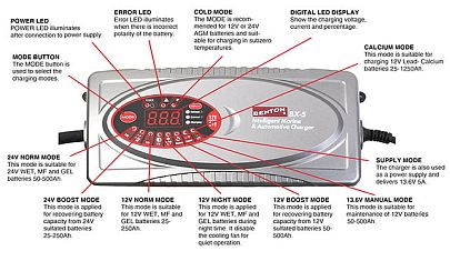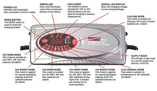 BENTON BX5 представляет собой 9-ступенчатое полностью автоматическое зарядное устройство, предназначенное для зарядки различных свинцово-кислотных аккумуляторов 12/24 В, широко используемых в моторных лодках, катерах, автомобилях, грузовиках, экскаваторах, тракторах.
