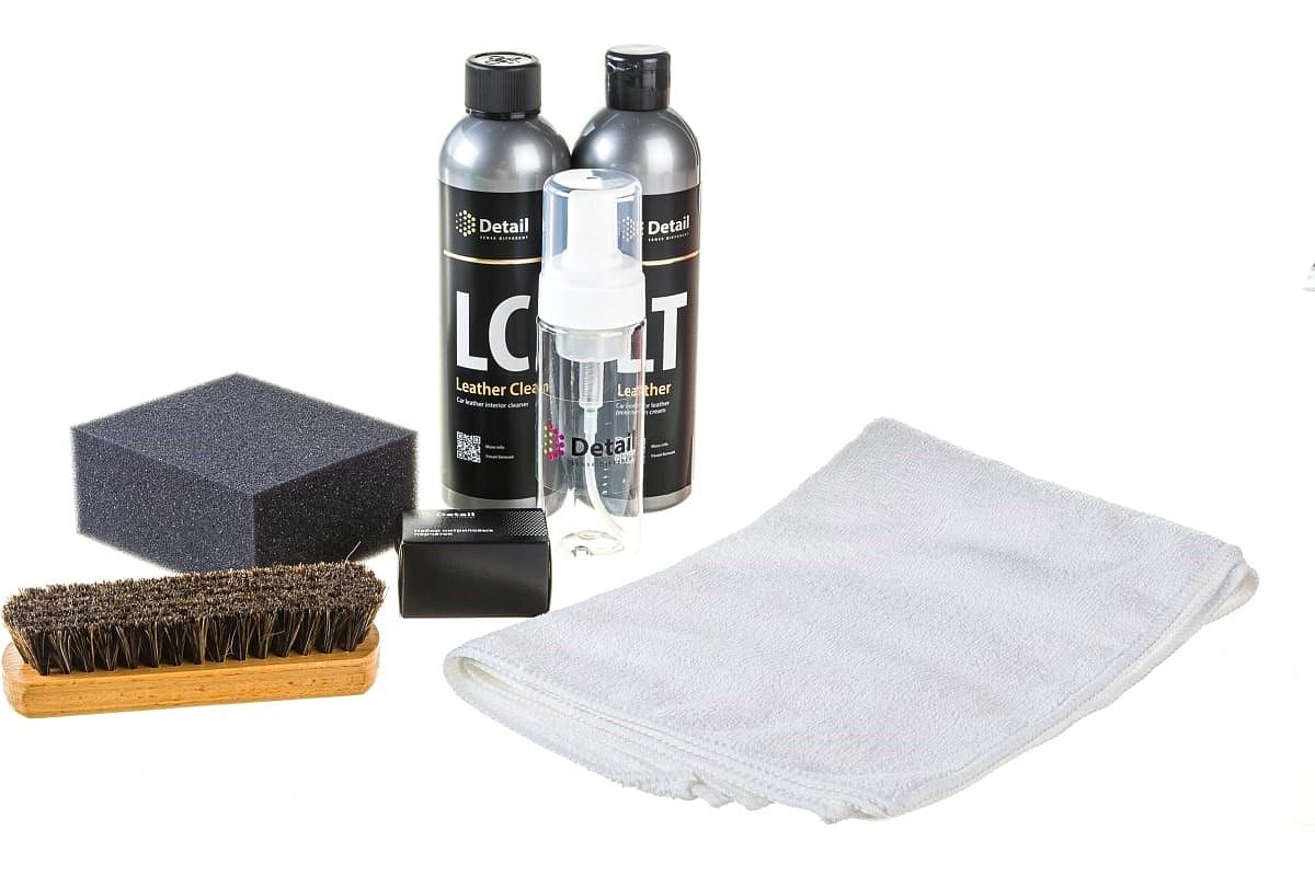 Набор по уходу за кожаным салоном, который включает в себя чистящее средство Leather Clean 500 ml, крем для защиты кожи Leather 500 ml, мягкая губка для нанесения крема, щетка для интерьера, пенообразователь, микрофибровое полотенце 3 шт., набор нитриловых перчаток.