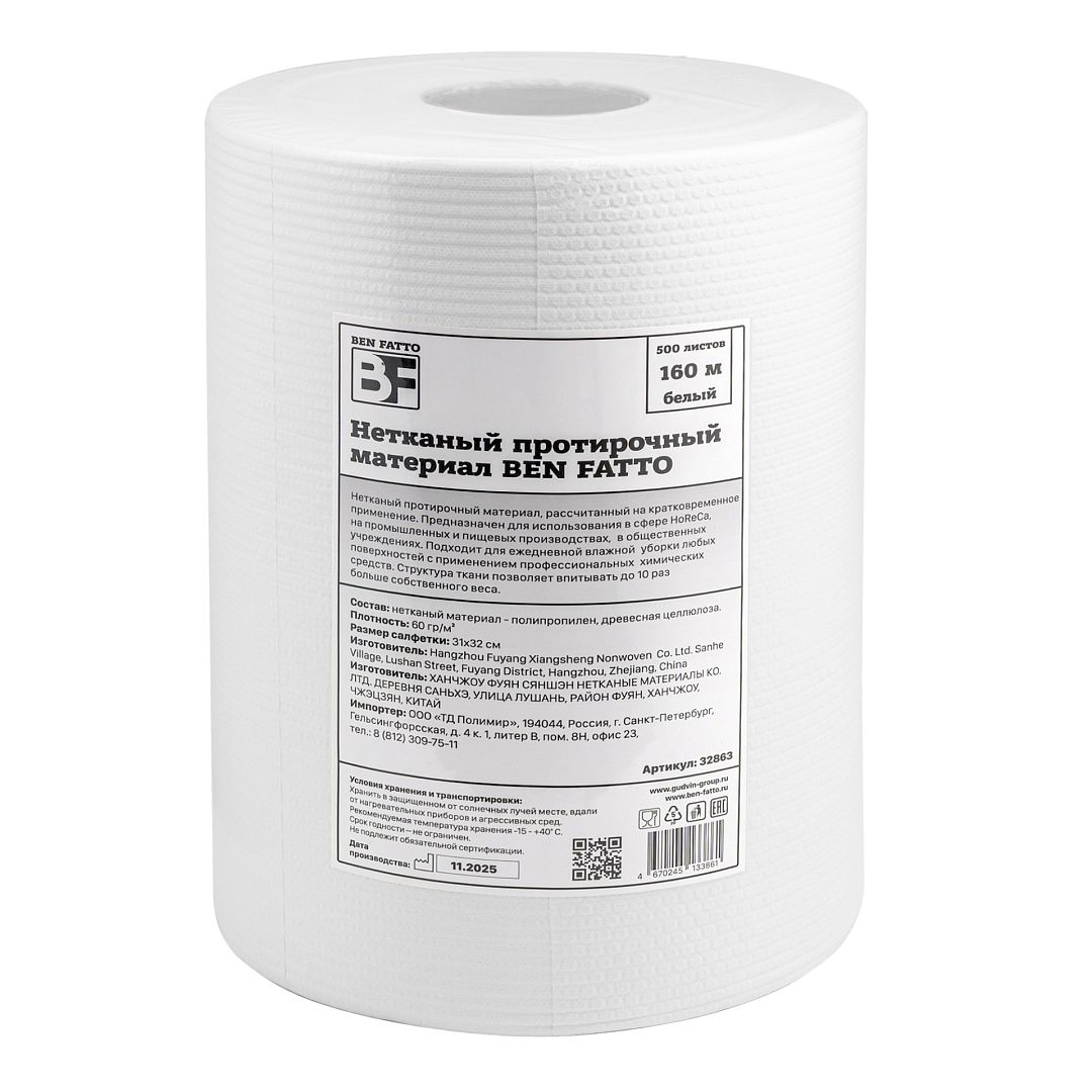 Нетканый протирочный материал, цвет белый, тиснение сота, Ben Fatto