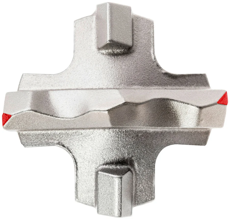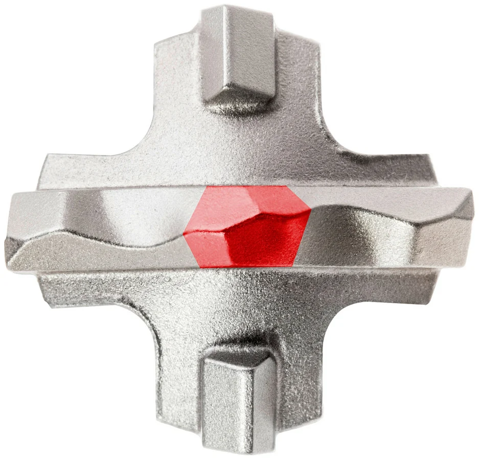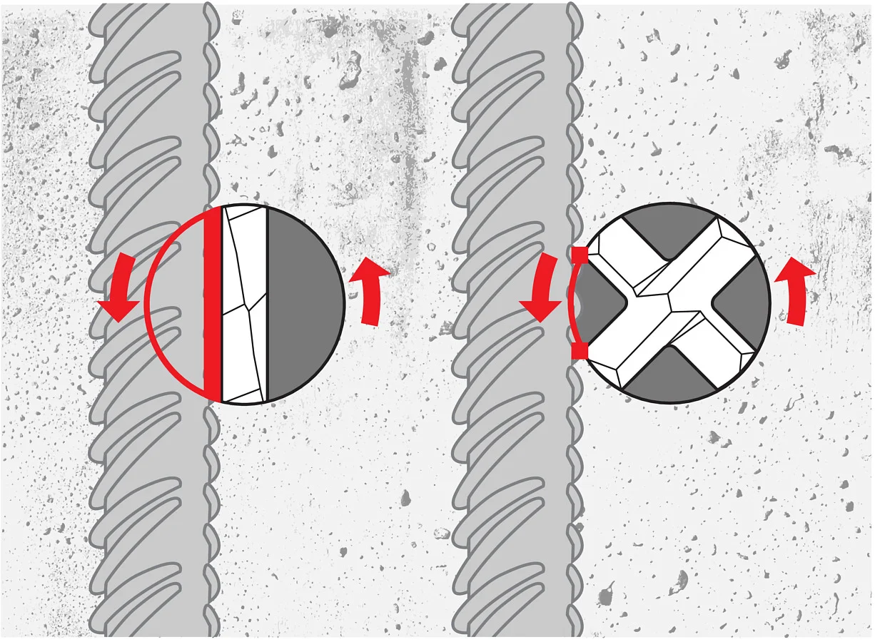 Симметричная геометрия режущих кромок 4 x 90° (до Ø 10 мм в случае твердосплавной головки) предотвращает заедание или увод бура при столкновении, например, с арматурой.