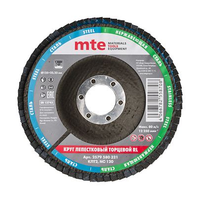 Круг лепестковый торцевой изогнутый КЛТ2 RL D125X22,2 мм, нормальный корунд (NC), зерно 120, mte