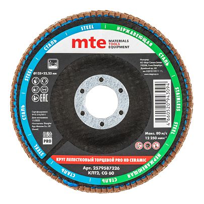 Круг лепестковый торцевой изогнутый КЛТ2 PRO HD CERAMIC D125X22,2 мм, керамическое зерно (CG) 60, mte