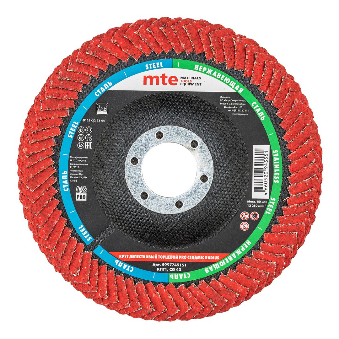 Круг лепестковый торцевой прямой КЛТ1 PRO КЕРАМИКА РАДИУС D125X22,2 мм, керамическое зерно (CG) 40, mte