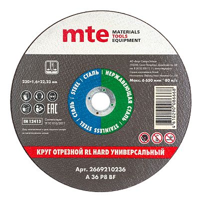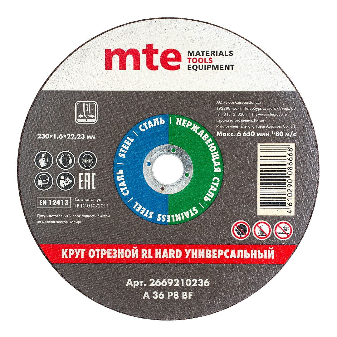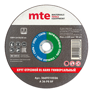 Круг отрезной RL ТВЕРДЫЙ, универсальный, D230X1,6X22,2 мм, mte