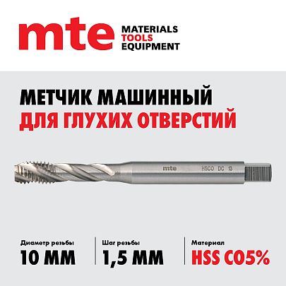 Метчик машинный HSS Co5% DIN 371 С для глухих отверстий M10X1,5, mte