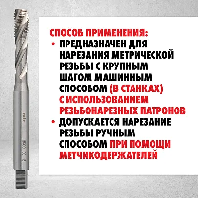 Предназначен для нарезания метрической резьбы с крупным шагом машинным способом (в станках) с использованием резьбонарезных патронов. Допускается нарезание резьбы ручным способом при помощи метчикодержателей.