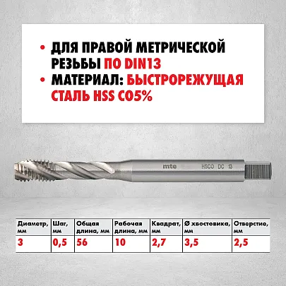 Метчик машинный HSS Co5% DIN 371 С для глухих отверстий M3X0,5, mte