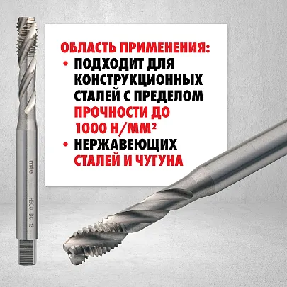 Подходит для конструкционных сталей с пределом прочности до 1000 Н/мм², нержавеющих сталей и чугуна.