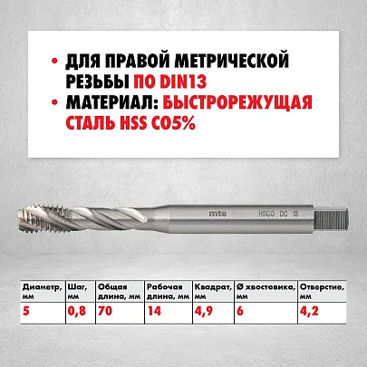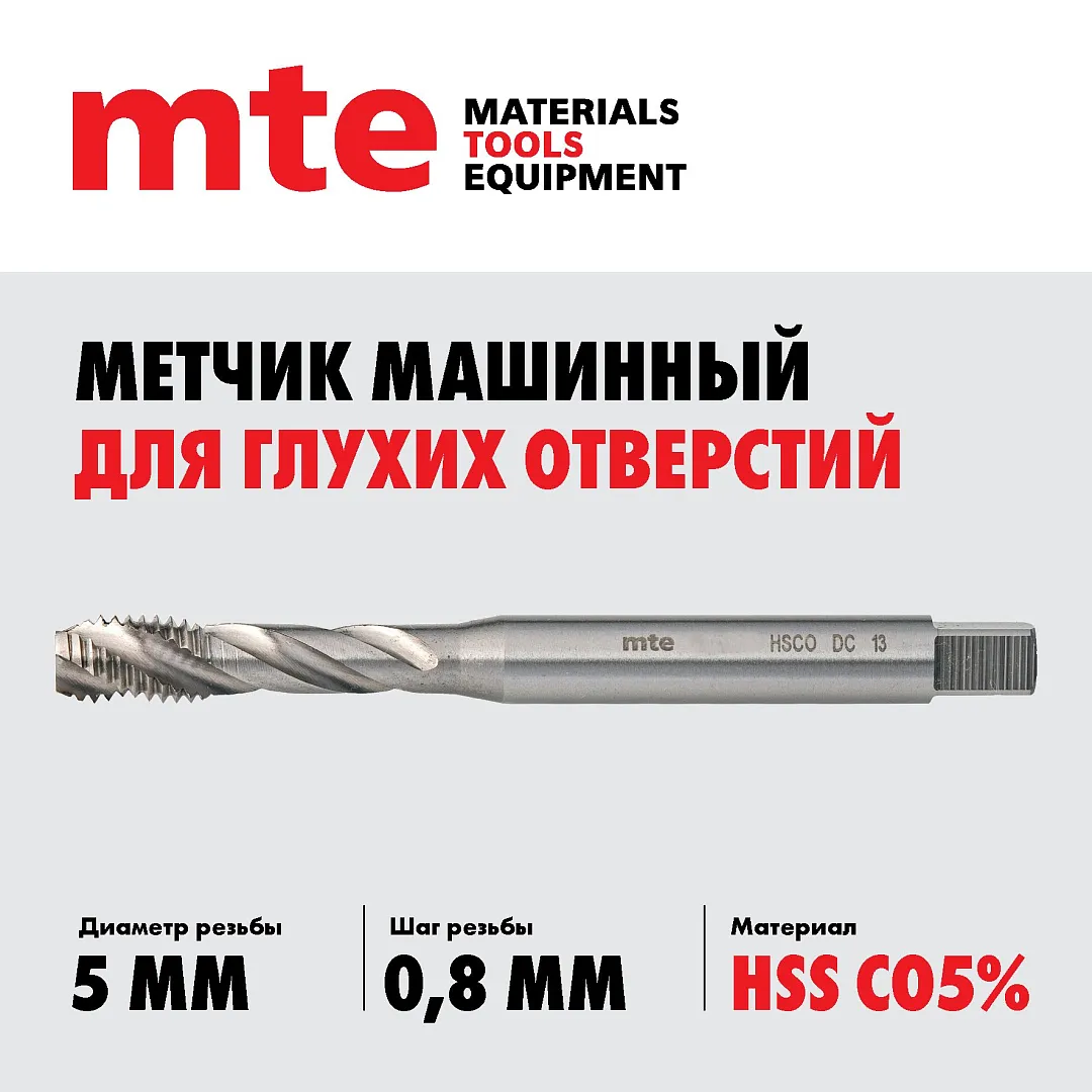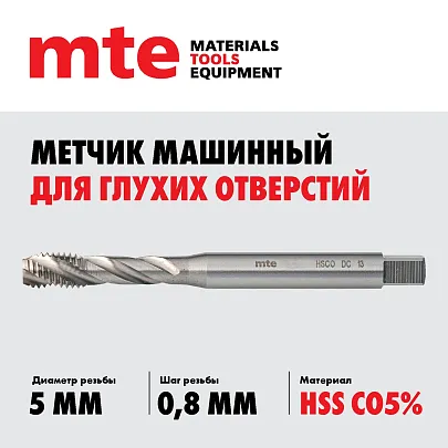 Метчик машинный HSS Co5% DIN 371 С для глухих отверстий M5X0,8, mte