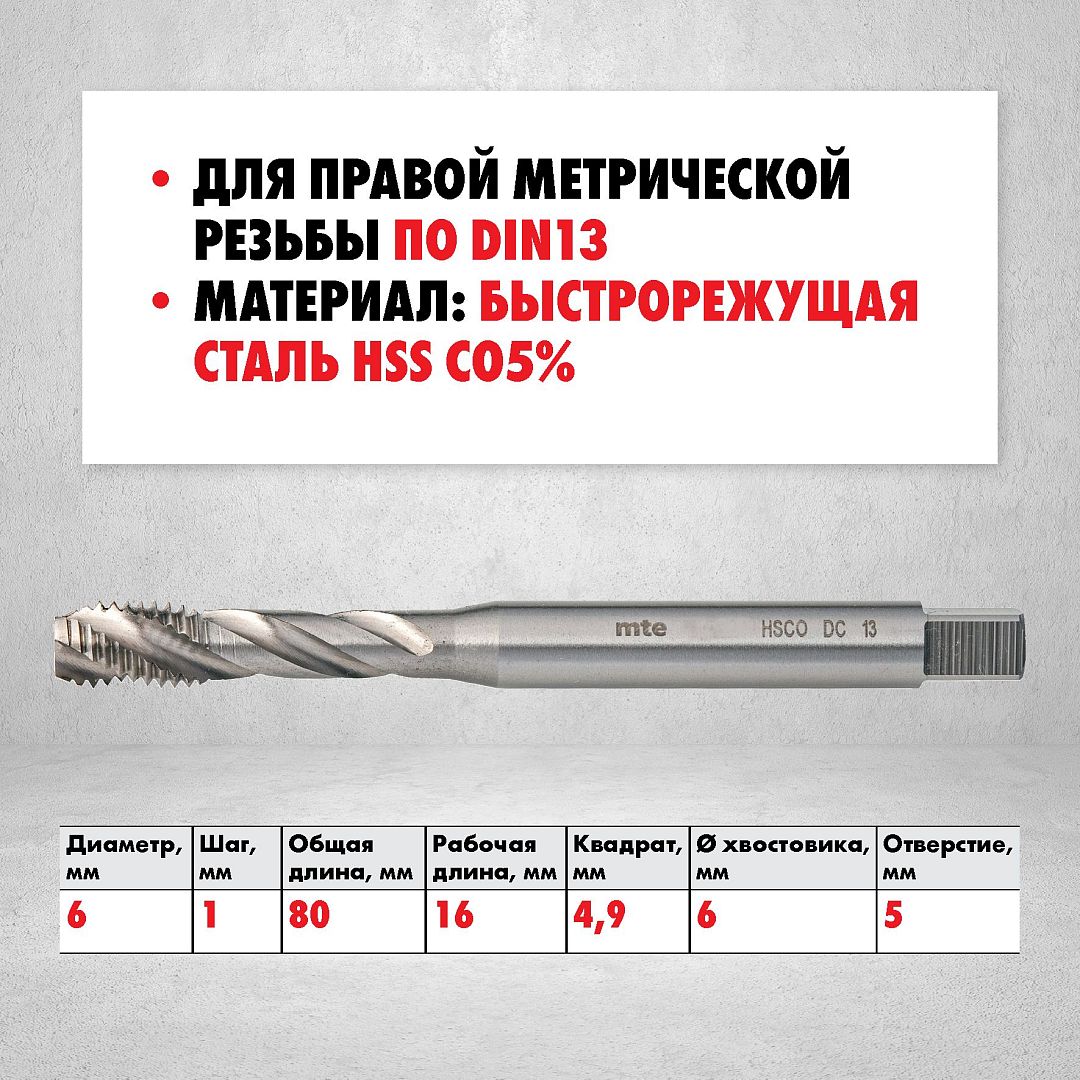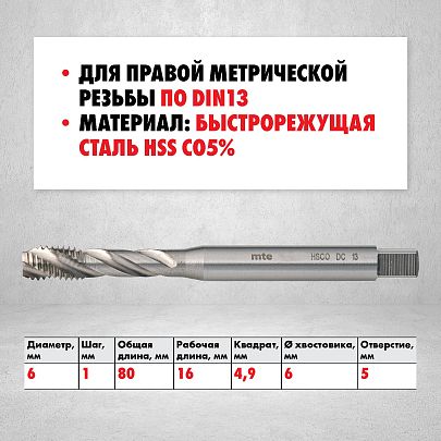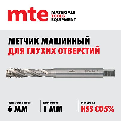 Метчик машинный HSS Co5% DIN 371 С для глухих отверстий M6X1,0, mte