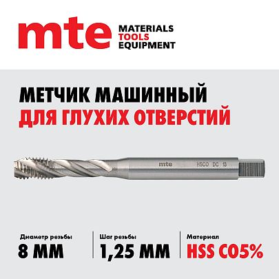 Метчик машинный HSS Co5% DIN 371 С для глухих отверстий M8X1,25, mte