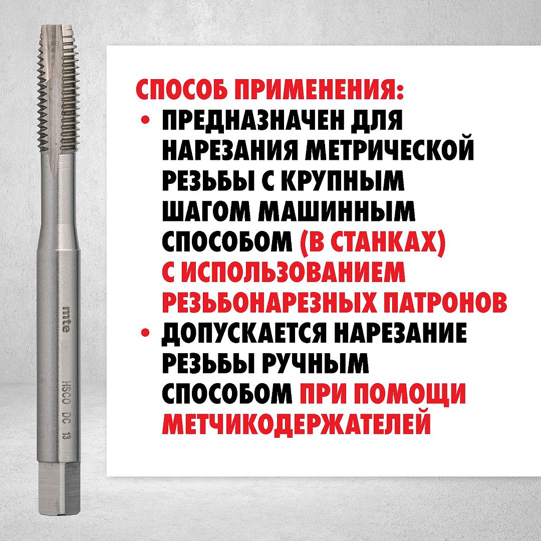 Предназначен для нарезания метрической резьбы с крупным шагом машинным способом (в станках) с использованием резьбонарезных патронов. Допускается нарезание резьбы ручным способом при помощи метчикодержателей.
