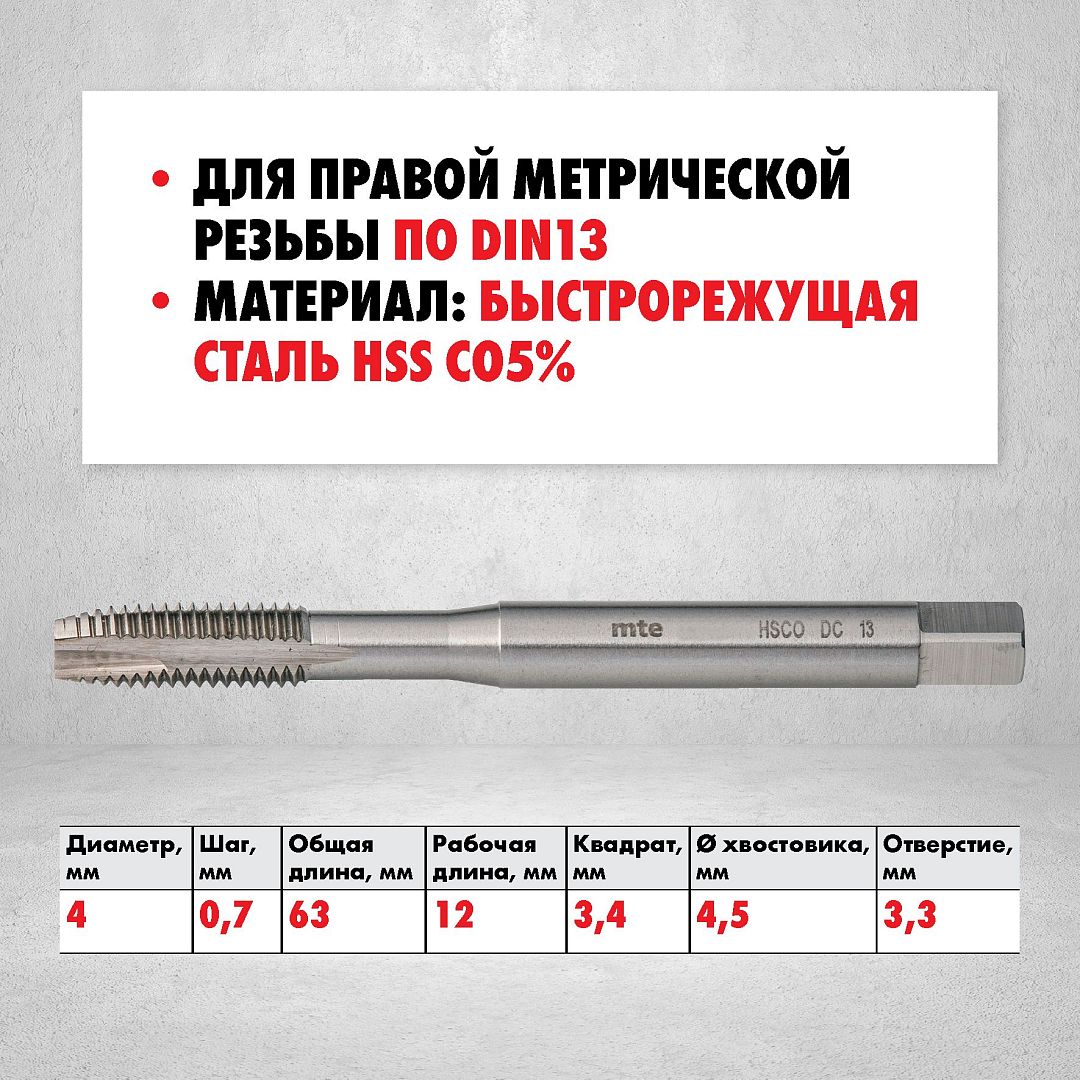 Метчик машинный HSS Co5% DIN 371 B для сквозных отверстий M4X0,7, mte