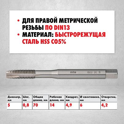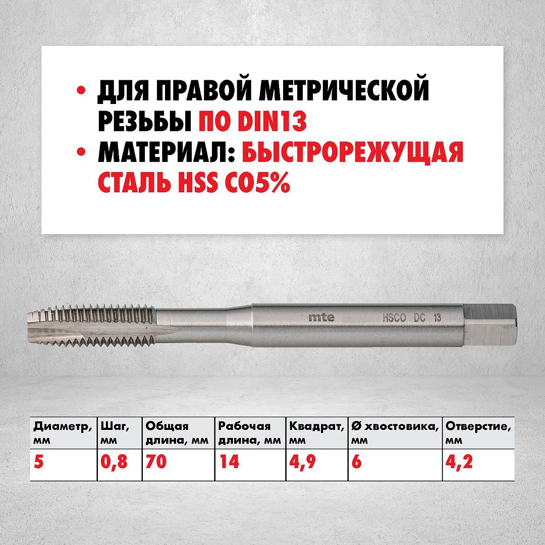 Метчик машинный HSS Co5% DIN 371 B для сквозных отверстий M5X0,8, mte