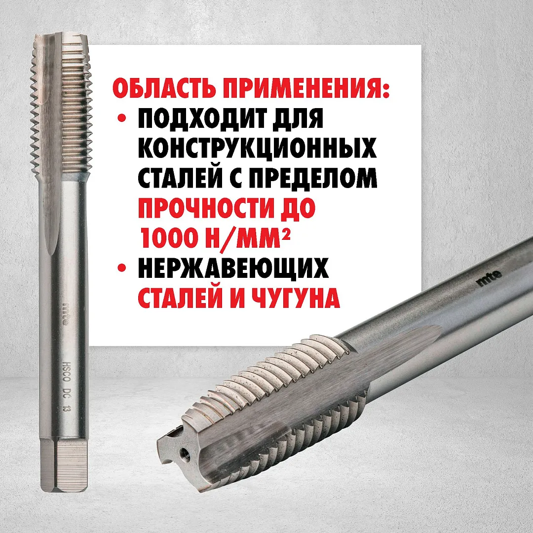 Подходит для конструкционных сталей с пределом прочности до 1000 Н/мм², нержавеющих сталей и чугуна.