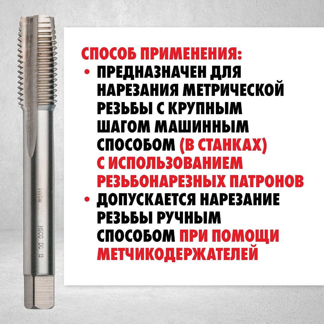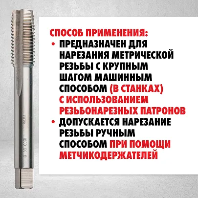 Предназначен для нарезания метрической резьбы с крупным шагом машинным способом (в станках) с использованием резьбонарезных патронов. Допускается нарезание резьбы ручным способом при помощи метчикодержателей.