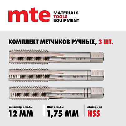 Метчики ручные HSS DIN 352, комплект 3 шт. M12X1,75, mte