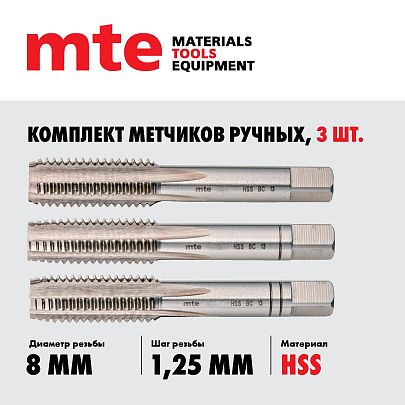 Метчики ручные HSS DIN 352, комплект 3 шт. M8X1,25, mte