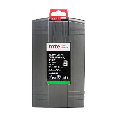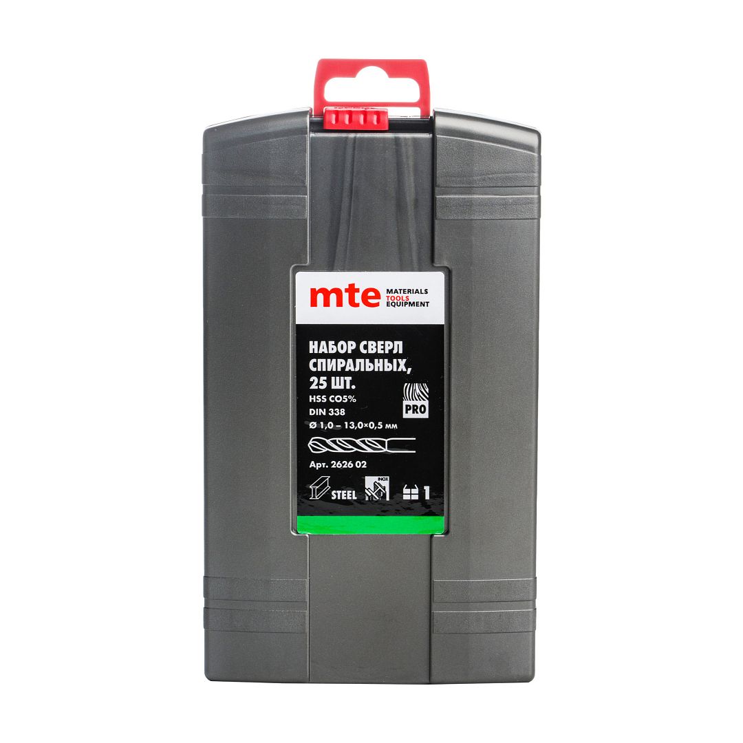 Набор сверл спиральных по металлу HSS Co5% PRO DIN 338 1-13 мм, шаг 0,5 мм, 25 шт., mte