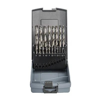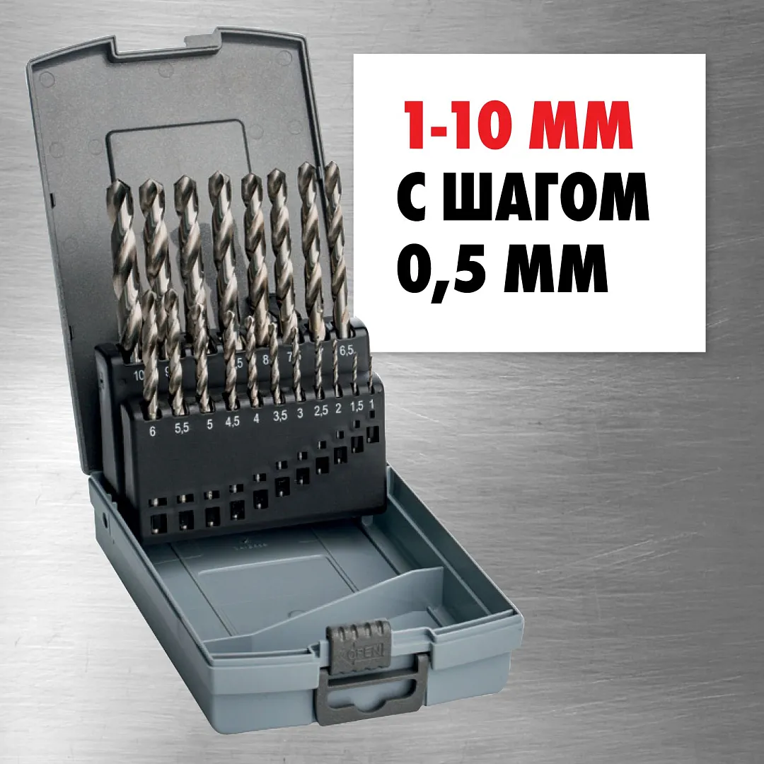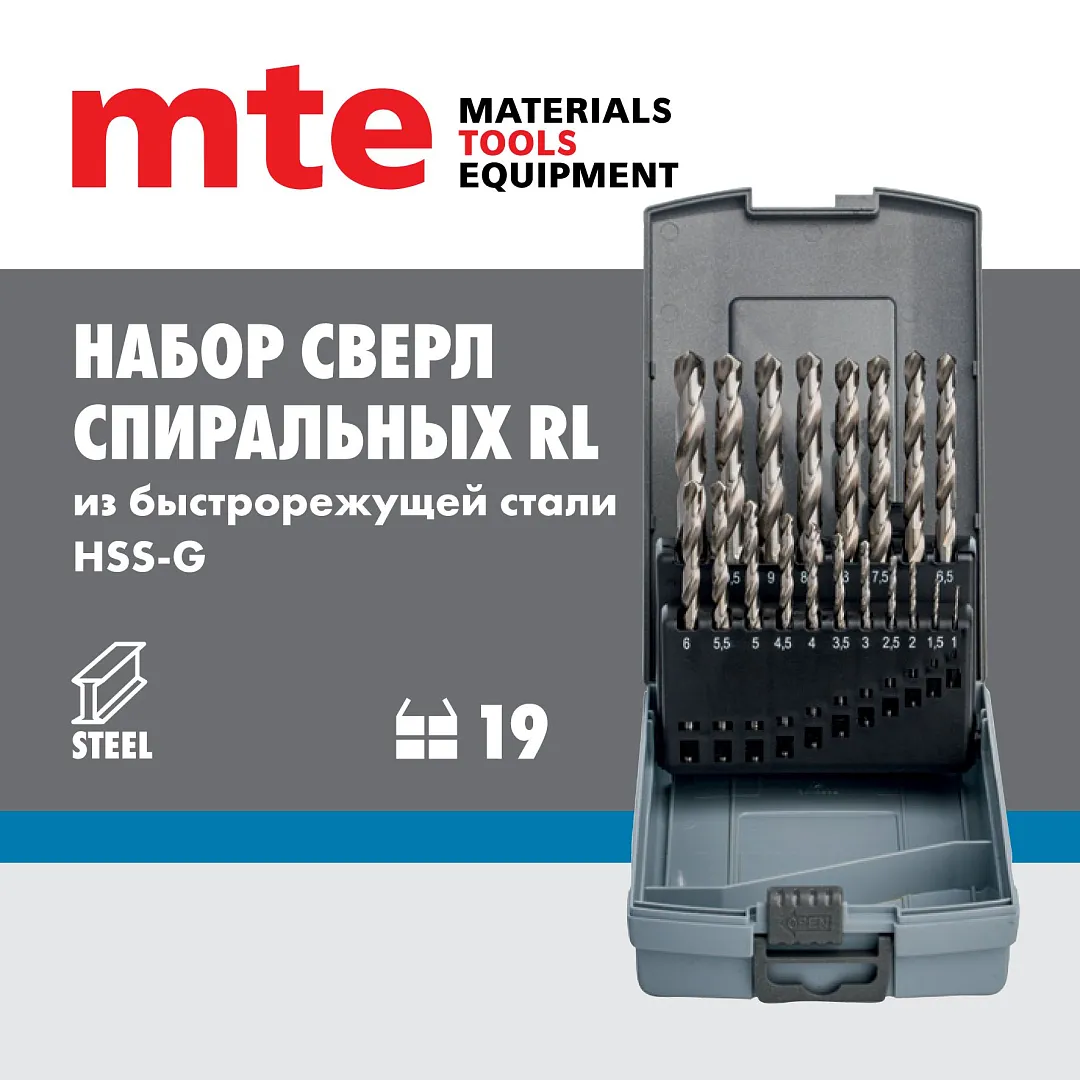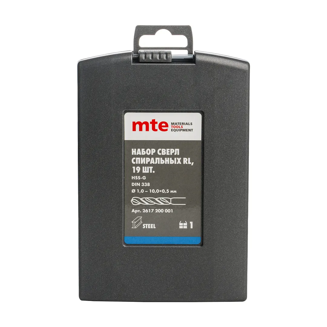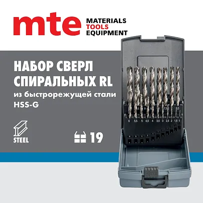 Набор сверл спиральных по металлу HSS-G RL DIN 338 1-10 мм, шаг 0,5 мм, 19 шт., mte