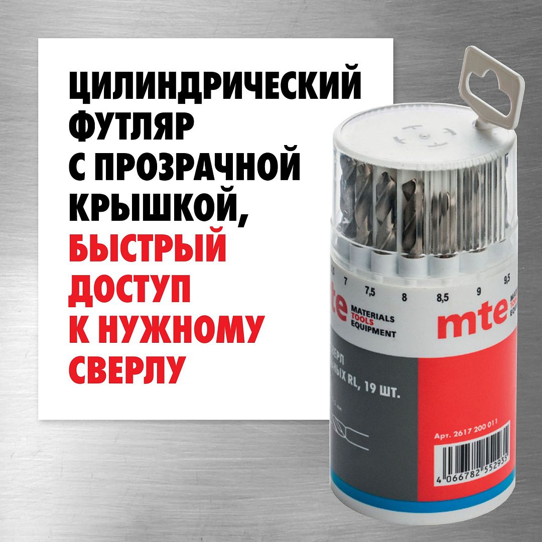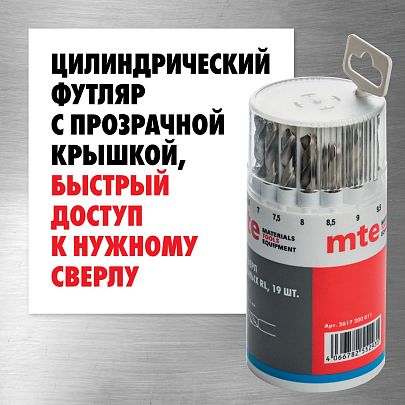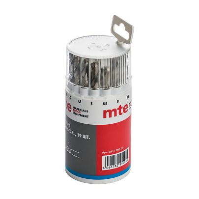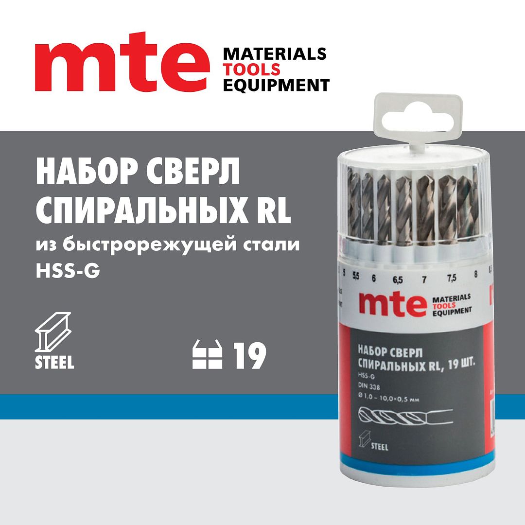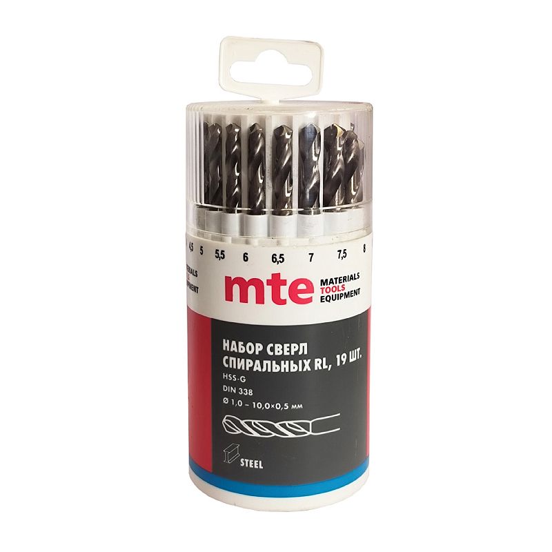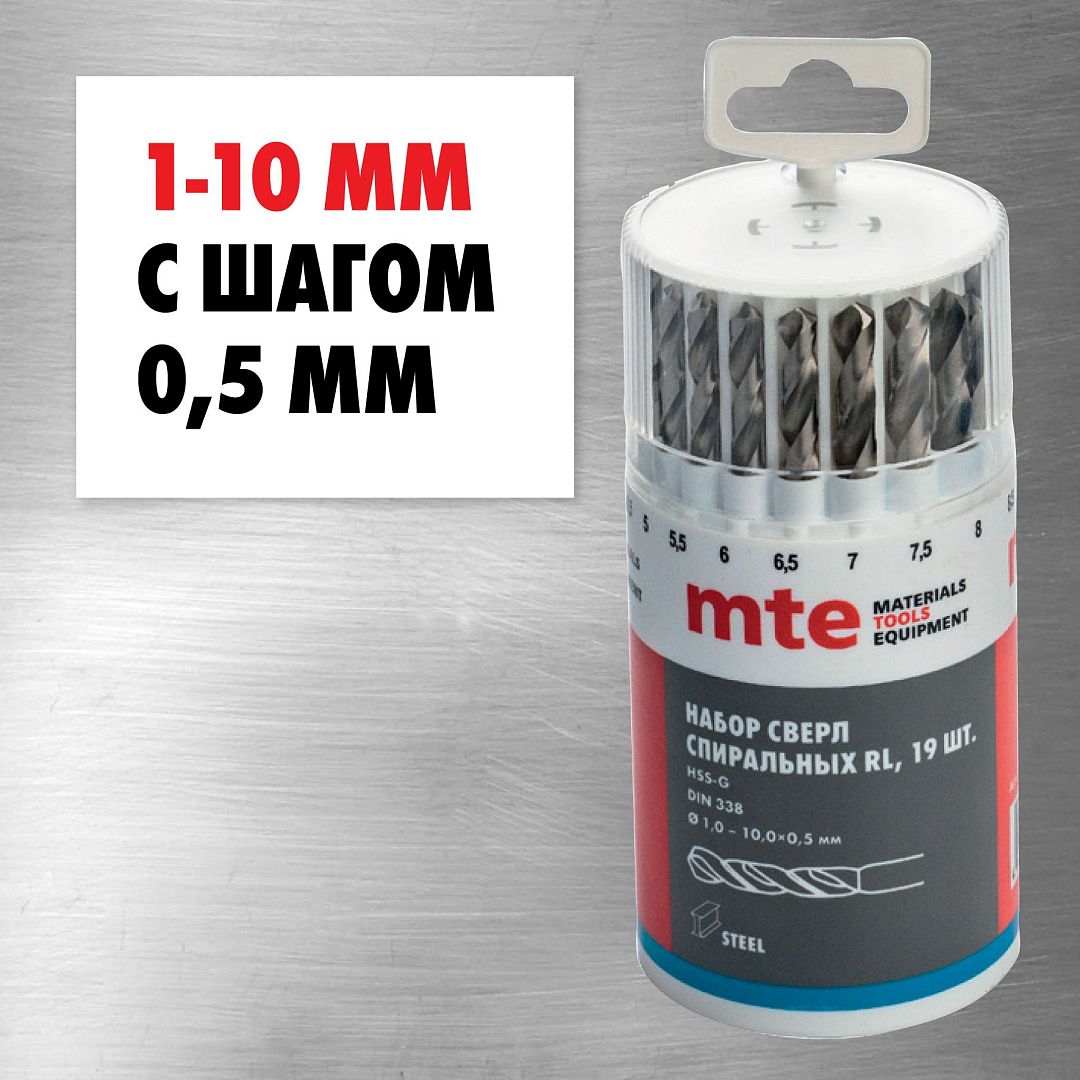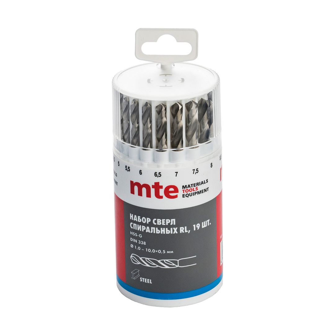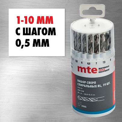 Набор сверл спиральных по металлу HSS-G RL DIN 338 1-10 мм, шаг 0,5 мм, 19 шт., mte