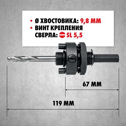 Шестигранный хвостовик имеет размер под ключ 8,6 мм, диаметр описанной окружности 9,8 мм (подходят под сверлильные патроны 1-10 мм)