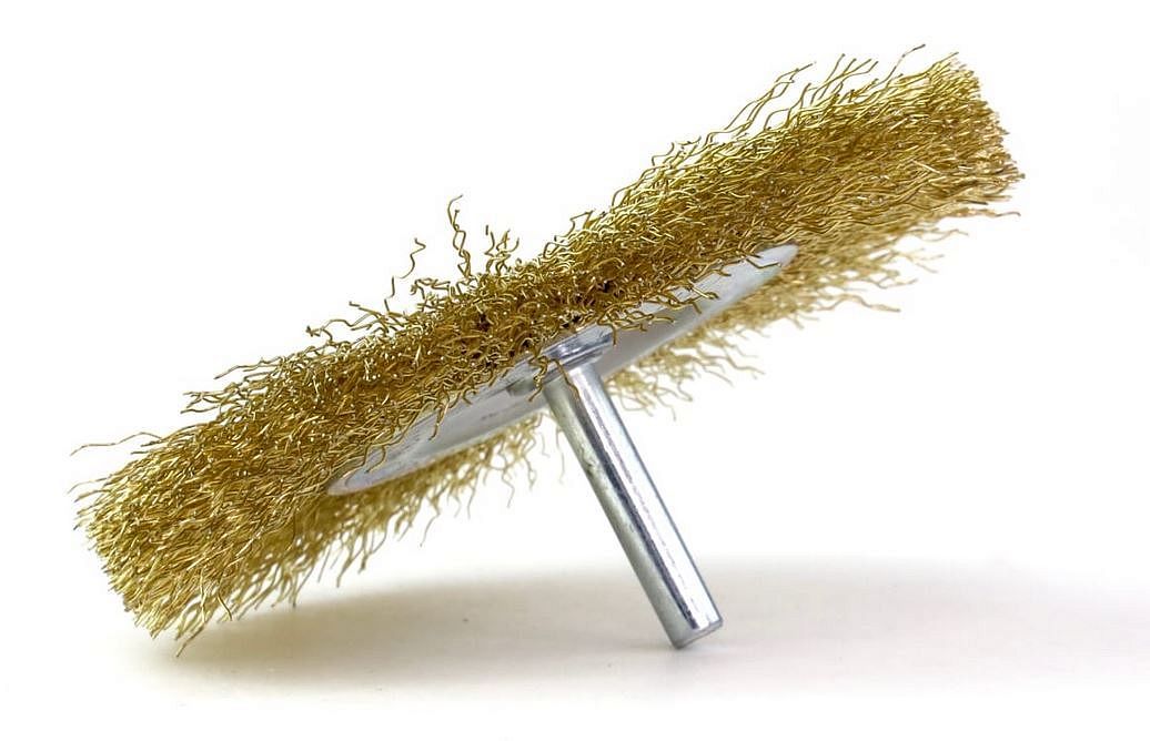 Щетка дисковая c хвостовиком для дрели, гофрир-ая латунир-я сталь D75X10X0,3X6 мм