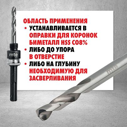 Устанавливается в оправки для коронок биметалл HSS Co8% либо до упора в отверстие, либо на глубину необходимую для засверливания.