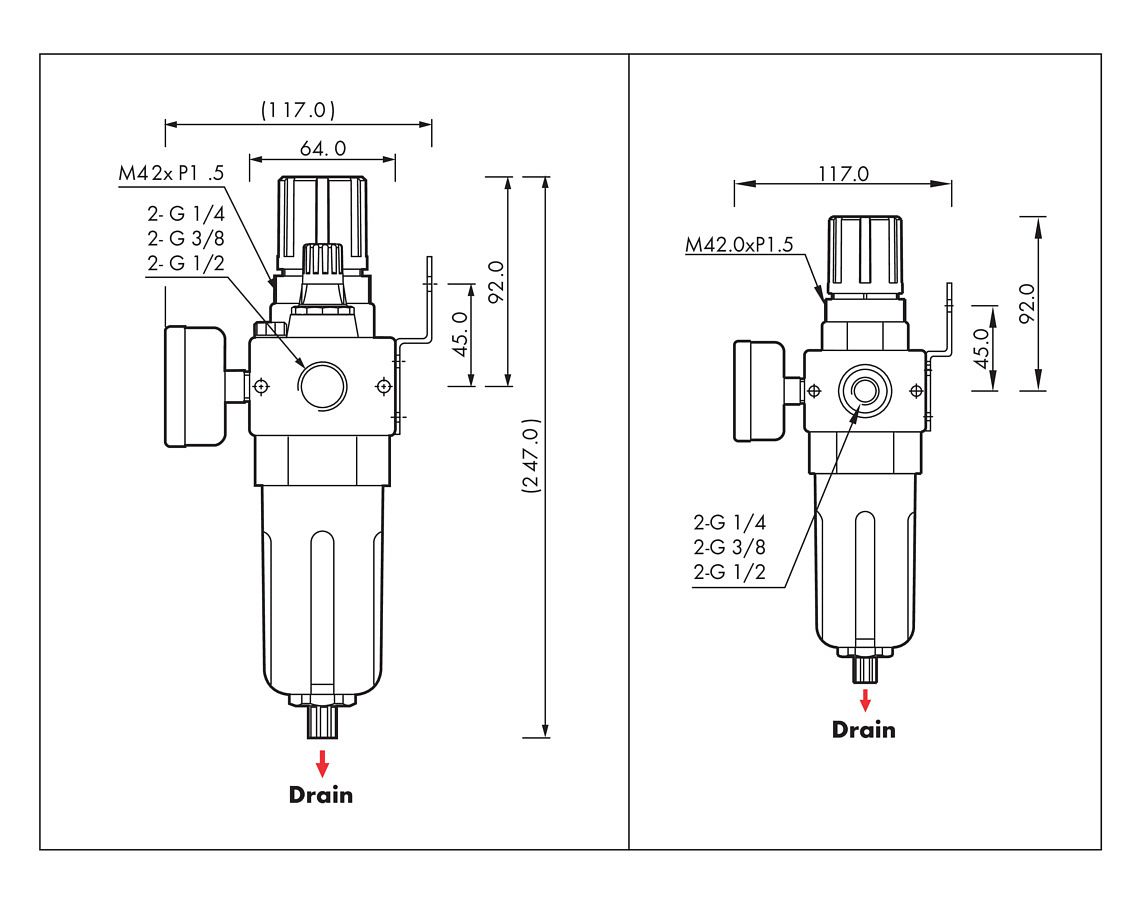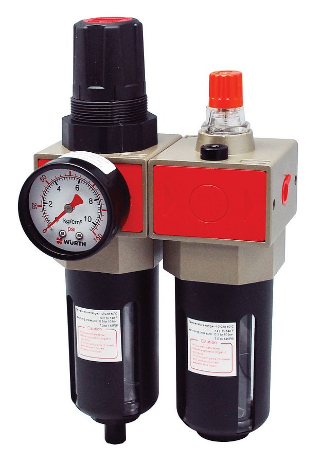 Устройство для обслуживания состоит из трех компонентов: Фильтр очищает воздух от пыли и конденсированной воды. Регулятор позволяет устанавливать точное рабочее давление для оптимальной работы прибора. Смазочное устройство подает на подключенные пневматические устройства регулируемый мелкий масляный туман.