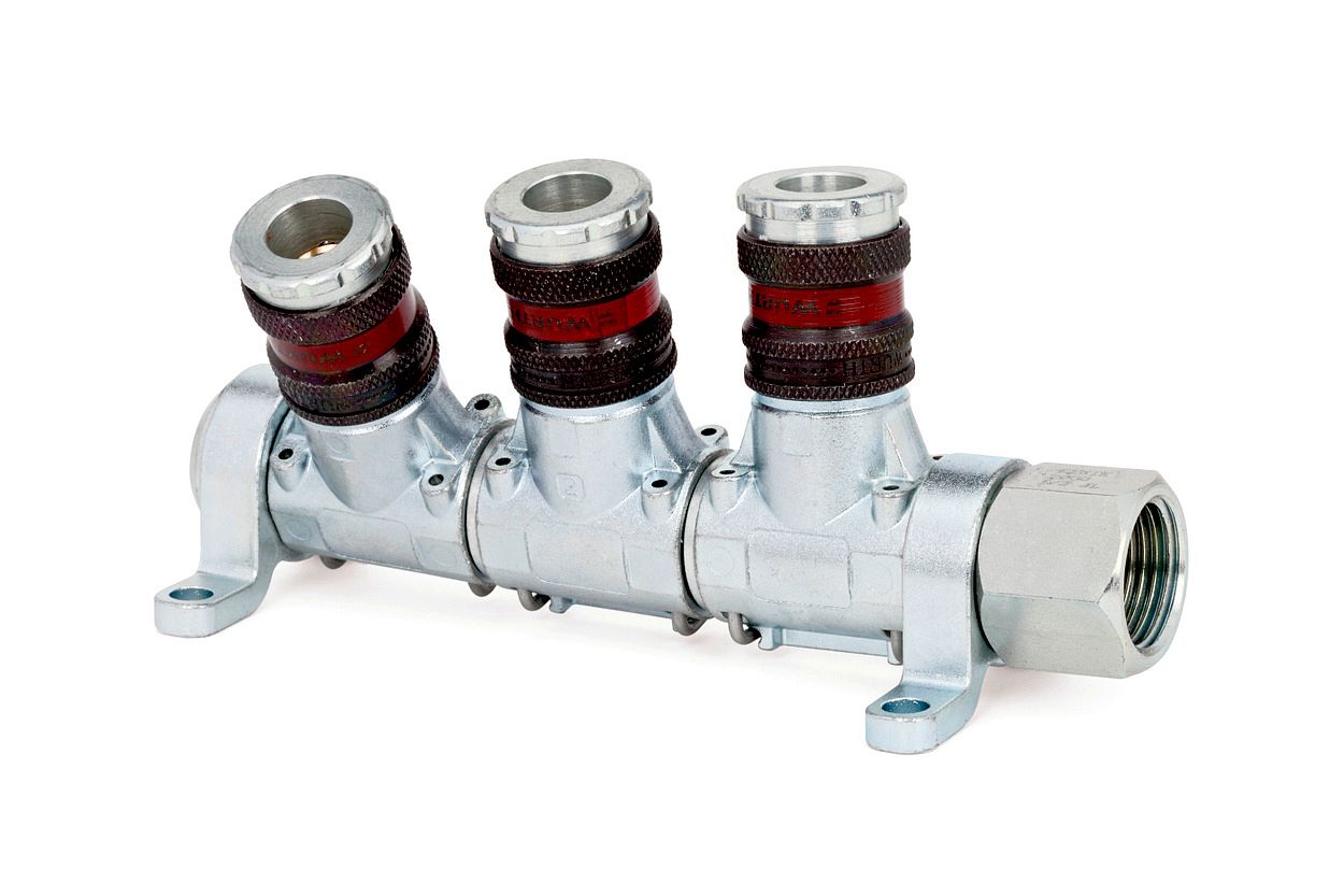 Многоканальный распределитель сжатого воздуха с тремя стандартными быстродействующими муфтами серии 2000.