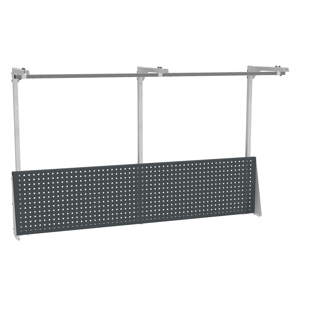 В комплекте перфорированная панель, комплект упоров, 3 стойки, 3 консоли, перекладина.
