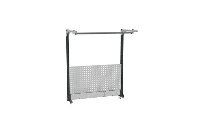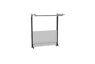 В комплекте короб для коммуникаций, перфорированная панель, комплект стоек боковых, 2 консоли и перекладина.