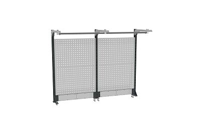 В комплекте 2 короба для коммуникаций, 4 перфорированные панели, стойка центральная и комплект стоек боковых, 3 консоли и перекладина.
